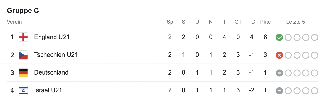 Am Mittwoch (18 Uhr) muss Deutschland nun gegen England gewinnen und gleichzeitig auf ein Unentschieden zwischen Israel und Tschechien hoffen.