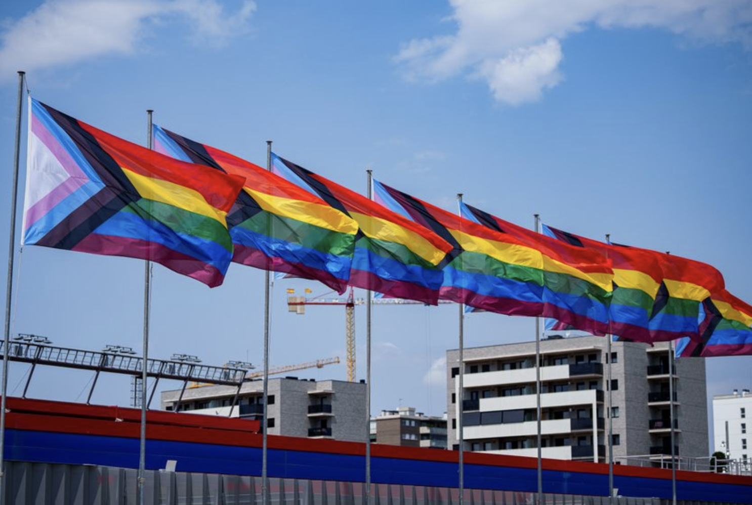 Zudem wurden an der Geschäftsstell der Katalanen mehrere Regenbogen-Fahnen aufghängt, um zu zeigen, dass man heute mit allen Queeren fühlt.
