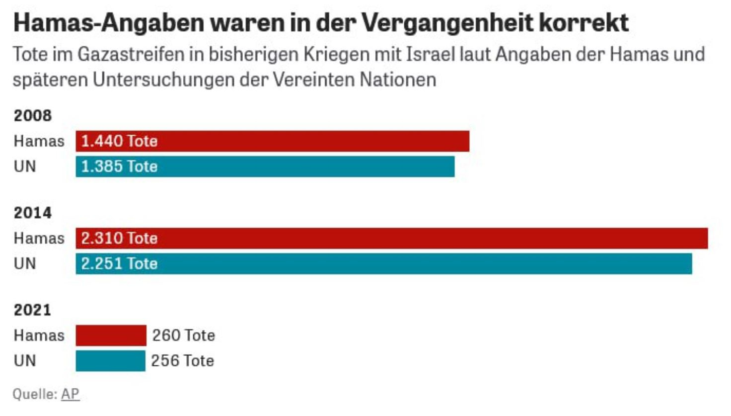 Klar zu erkennen: Bei früheren Gazakriegen stimmen die Angaben der Hamas mit den später ermittelten Daten durch die UNO immer nahezu überein…