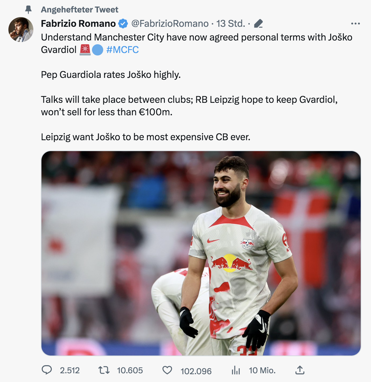 Jetzt muss nur noch RB überzeugt werden. In Leipzig fordert man mindestens 100 Millionen Ablöse – weil Gvardiol noch 4 Jahre Vertrag hat.