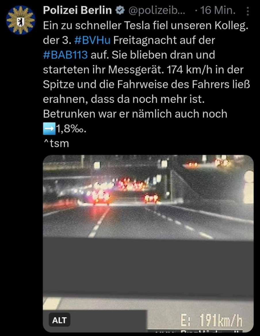 Die Berliner Polizei erwischt den Tesla auf der Bundesautobahn 113.