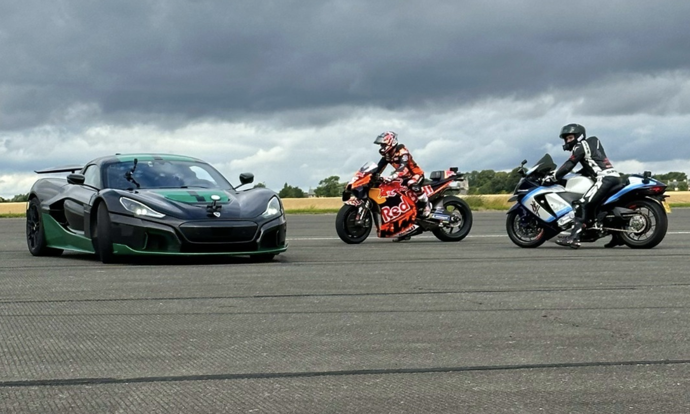 CarWow hat das aktuell wohl schnellste Auto der Welt, den Rimac Nevera mit 1914 PS und zwei Motorräder organisiert.