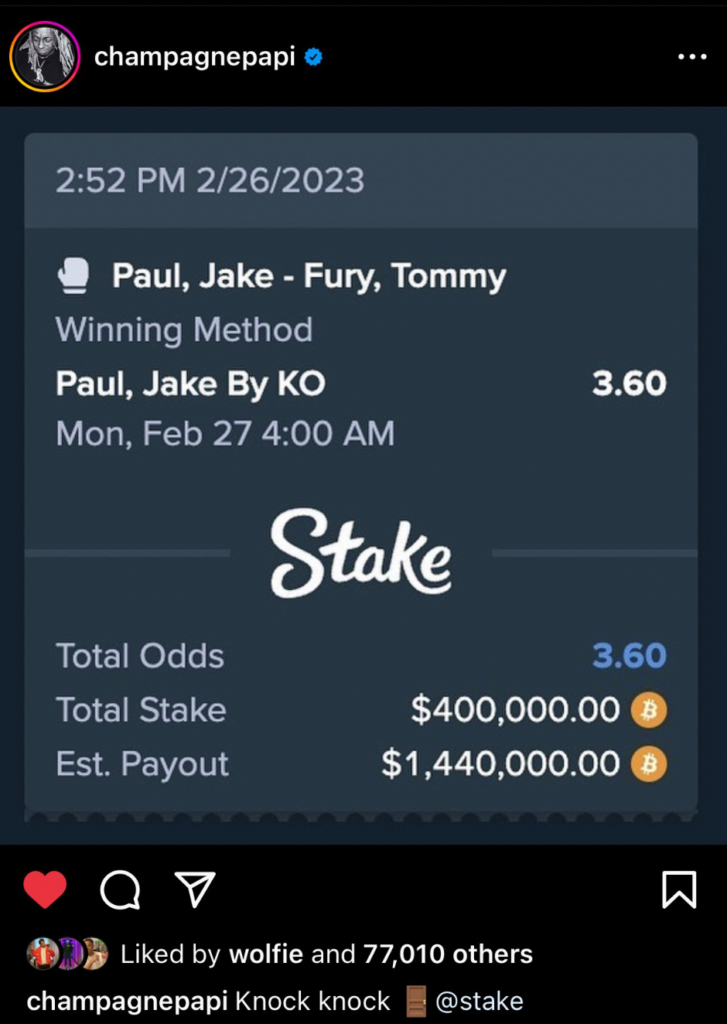 Denn der Rapper setzt ganze 400.000 Dollar auf den Gewinn von Jake Paul durch ein KO seines Gegners. Sein möglicher Gewinn – rund 1 Million Euro!