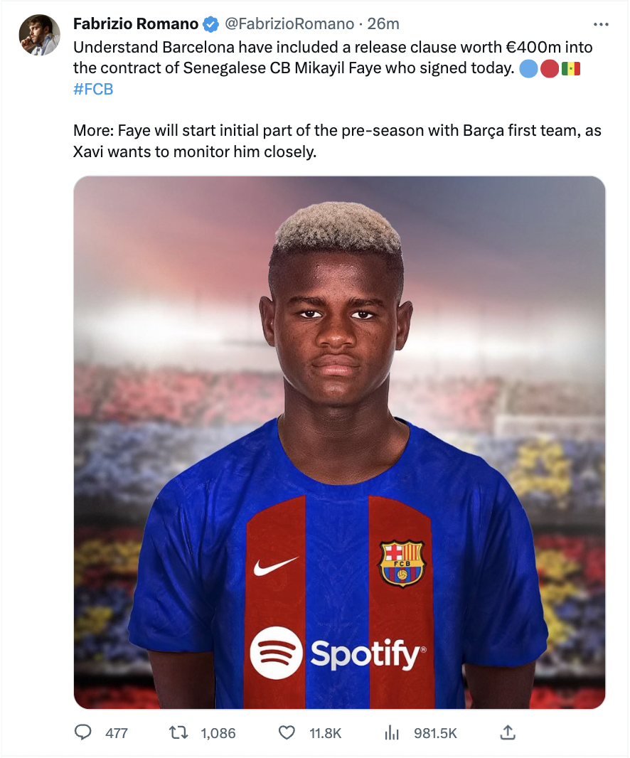 Der 2004 (!) geborene Senegalese Mikayil Faye wechselt im Sommer 2023 vom kroatischen Verein NK Kustosija zum FC Barcelona und soll dort unter Xavi direkt mit den Profis am Start sein.