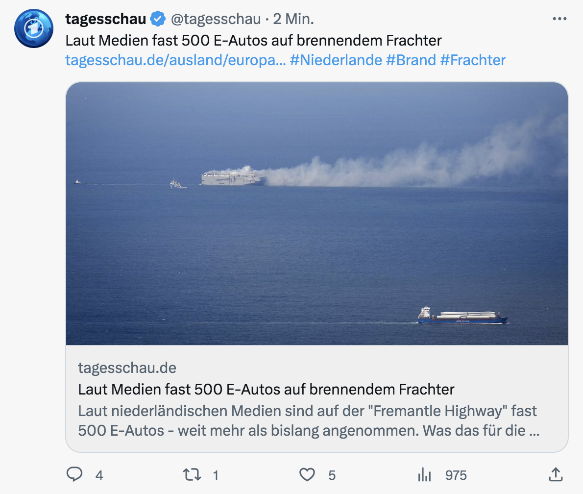 In der Nacht auf Mittwoch gerät das Riesen-Schiff „Fremantle Highway“ auf der Nordsee in Brand. Ein E-Auto hatte das Feuer ausgelöst! Oder sind es noch mehr?