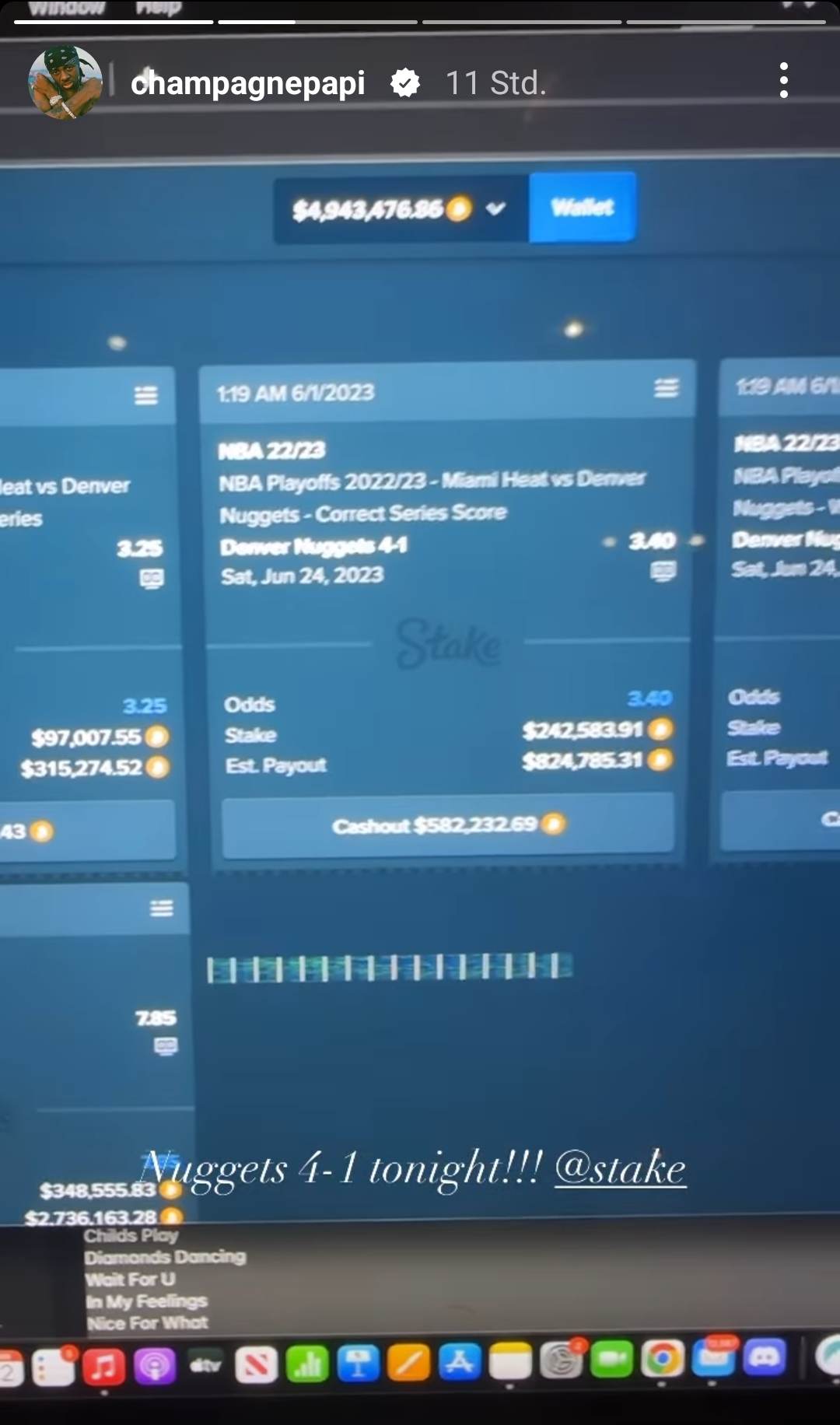 In seiner Instagram-Story zeigt Drake, dass er fast 250.000 Dollar (230.000 Euro) auf einen 4:1-Sieg der Denver Nuggets gesetzt hat.