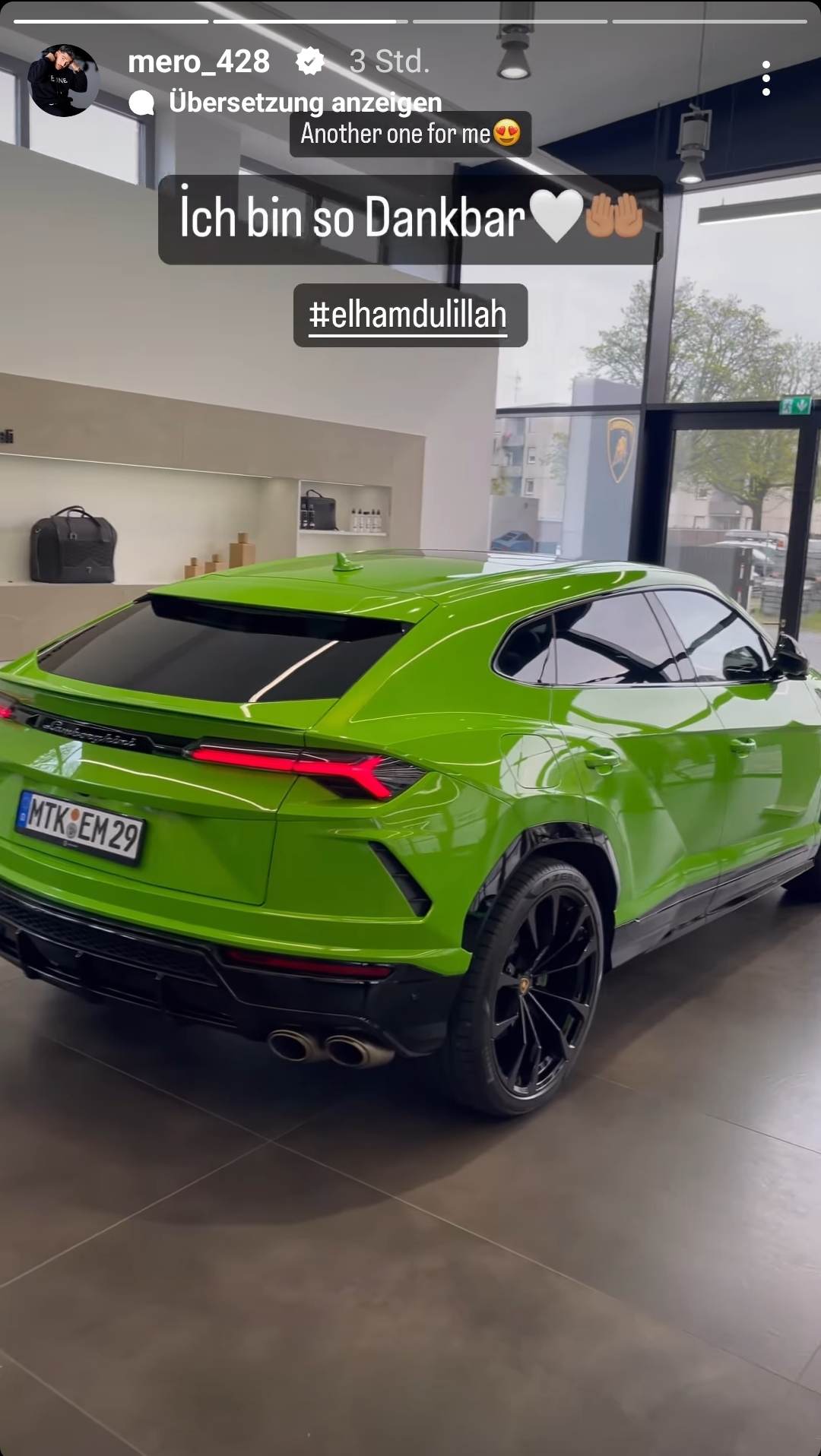 In seiner Instagram-Story zeigt Mero, dass man in ab sofort in einem giftgrünen Lamborghini Urus sehen kann.
