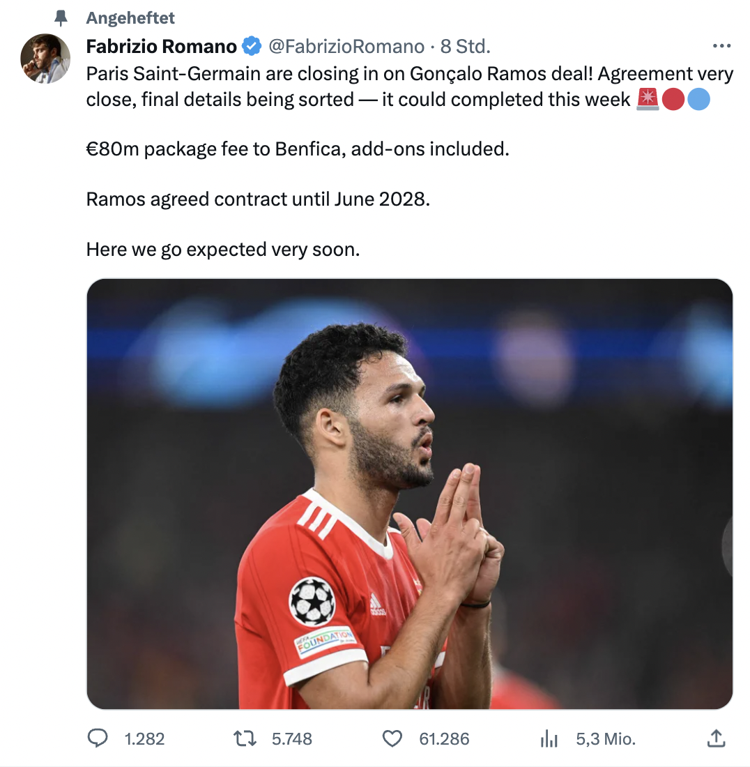 „PSG vor Deal mit Gonçalo Ramos. Die Einigung steht kurz bevor, die letzten Details werden geklärt – wohl sogar noch diese Woche.