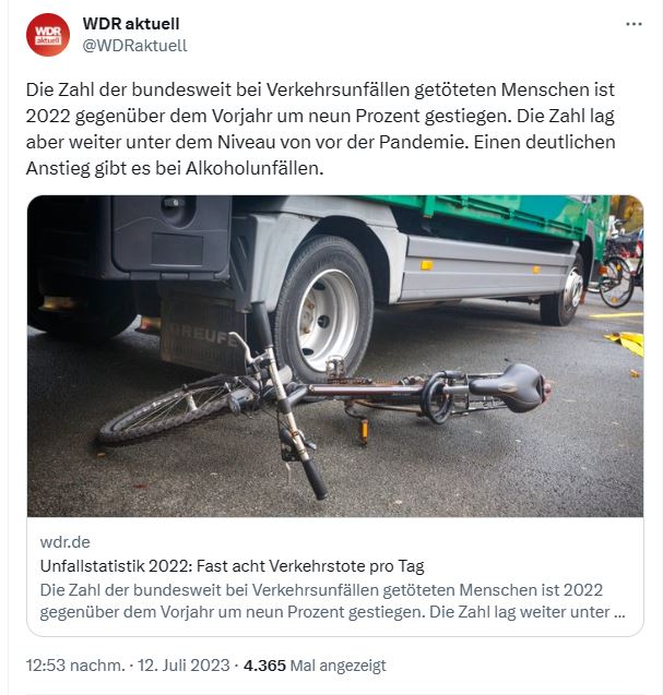 2788 Menschen sterben laut des Statistischen Bundesamts 2022 auf Deutschlands Straßen. 17 Prozent (474) davon sind mit dem Rad unterwegs.