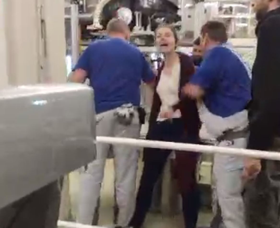 Antwortet einer der Mitarbeiter, bevor er eine Aktivistin Richtung Ausgang befördert.