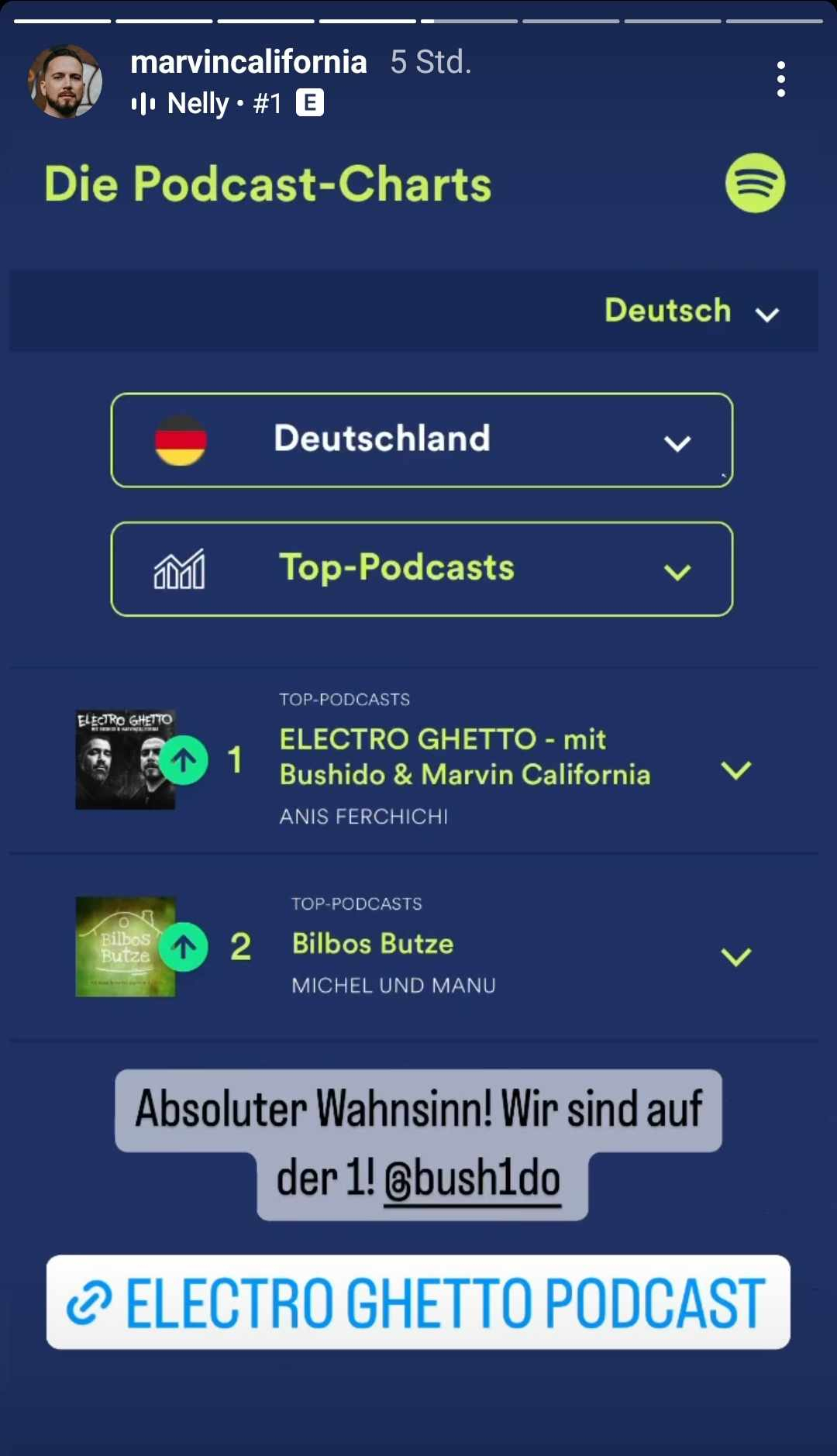 In seiner Instagram-Story zeigt MarvinCalifornia, dass „Electro Ghetto“ ab sofort der Nummer 1-Podcast in Deutschland ist – Kategorie übergreifend!