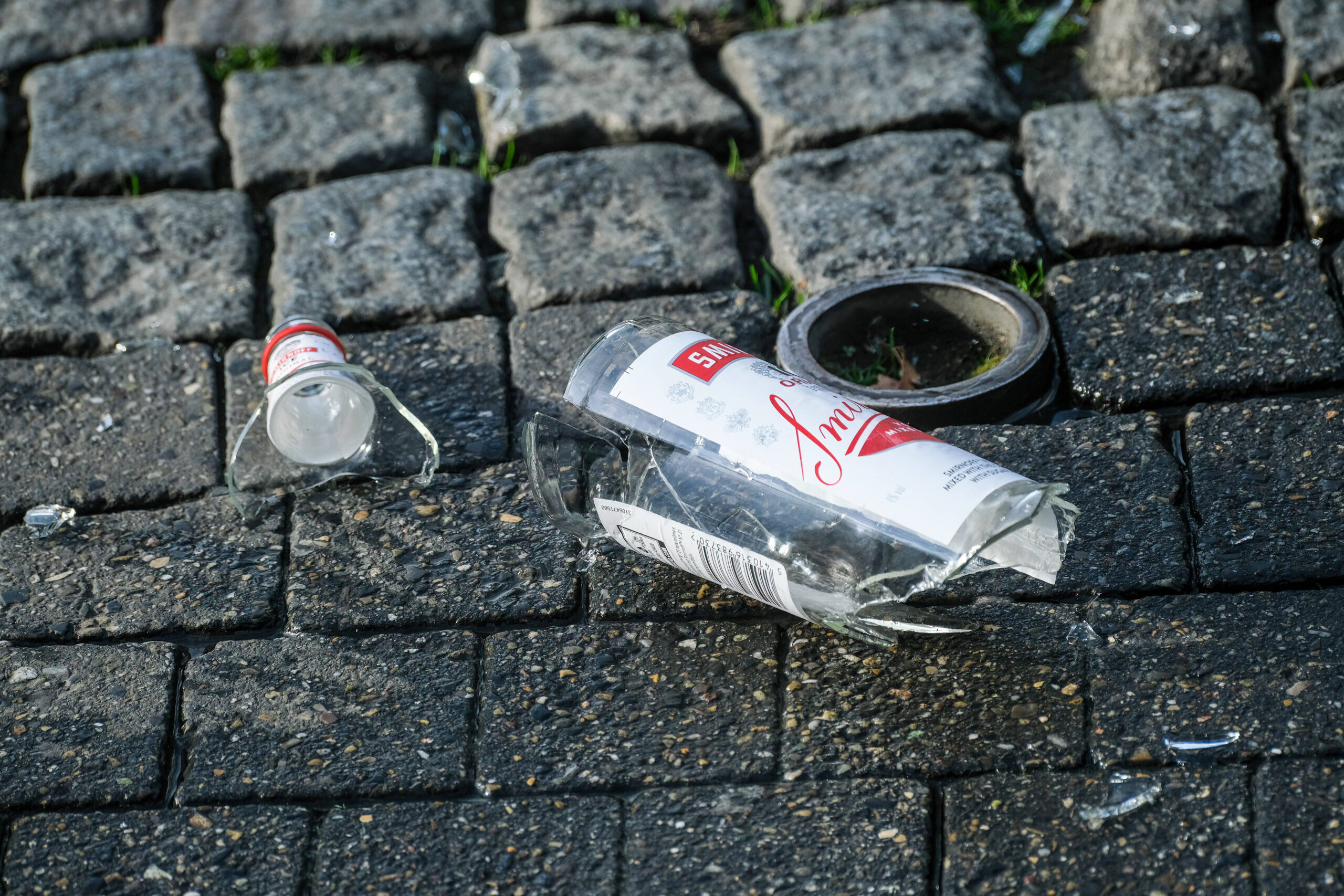 Lascalles stoßt den Angreifer weg. Einer aus der gegnerischen Gruppe (6-8 Mann) reagiert und wirft eine Wodkaflasche in Richtung des Spielers.