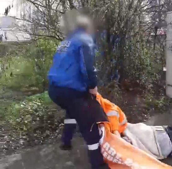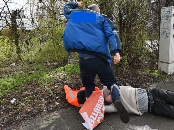 Einen von ihnen zieht der Mann auf den Bürgersteig und tritt dann kräftig in dessen Bauch.