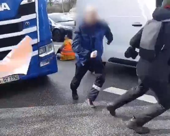 Kurzerhand stürmt er auf die Aktivisten zu, welche sich gerade auf der Straße festkleben wollen.