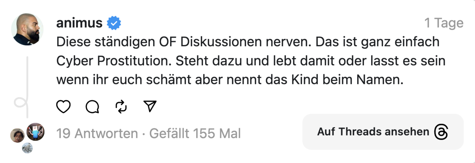 „Diese ständigen OF-Diskussionen nerven. Das ist ganz einfach Cyber Prostitution. Steht dazu und lebt damit oder lasst es sein wenn ihr euch schämt aber nennt das Kind beim Namen“