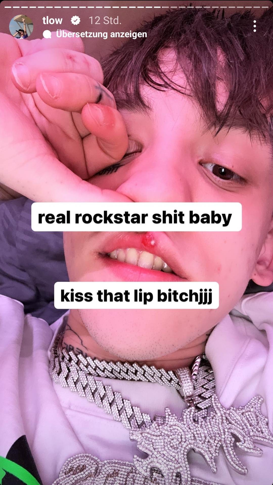 Das Resultat: Seine Lippe ist komplett aufgeplatzt. Die Tour lässt sich T-Low dadurch jedoch nicht vermiesen.