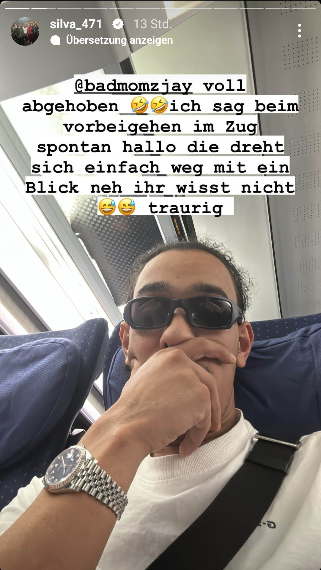 „Badmomzjay voll abgehoben. Ich sage beim vorbeigehen im Zug spontan ‚Hallo‘. Die dreht sich einfach weg mit ein Blick. Ne, Ihr wisst nicht. Traurig“