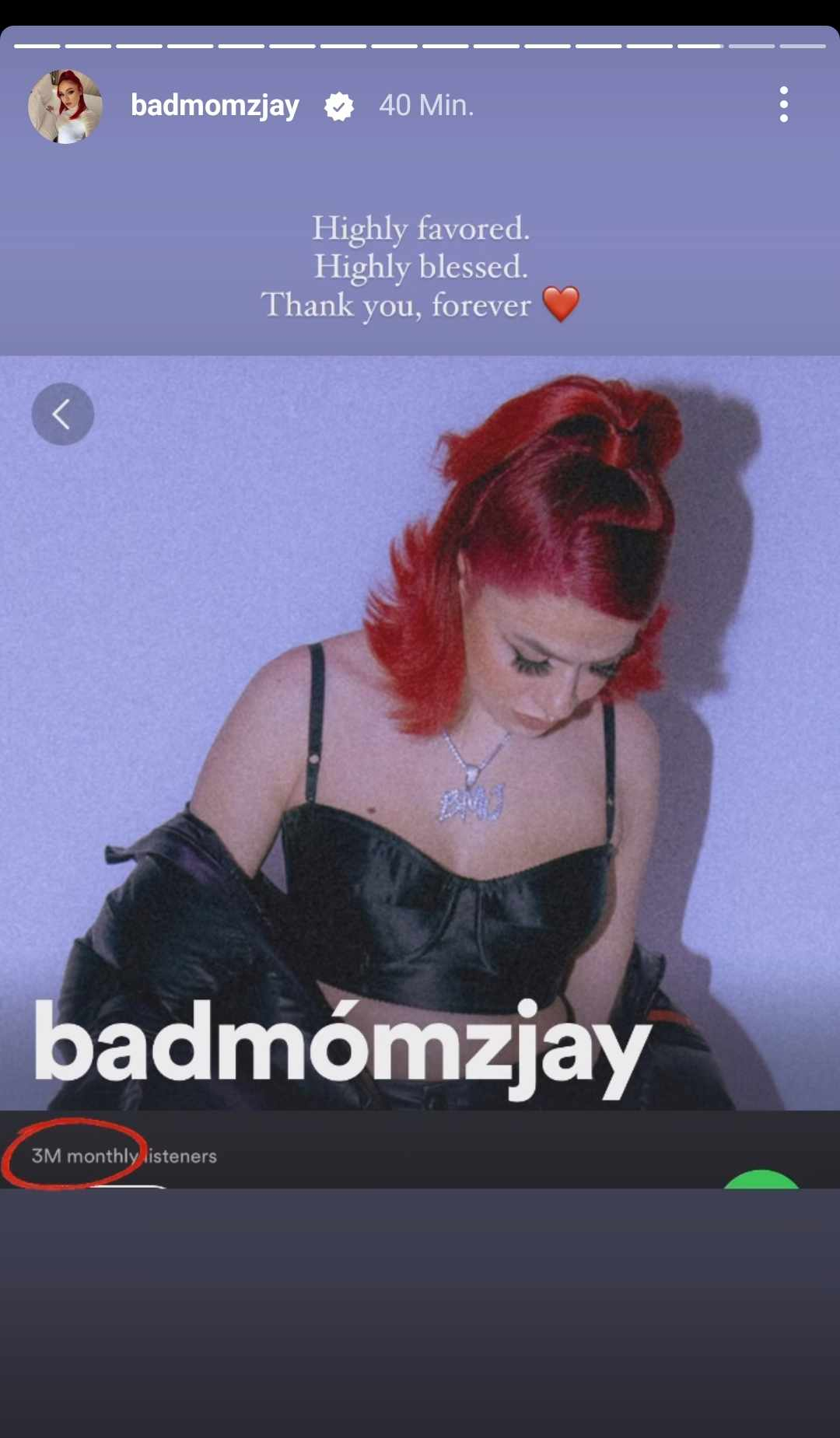In ihrer Instagram-Story zeigt Badmomz, dass sie die 3 Millionen monatlichen Hörer auf Spotify geknackt hat.