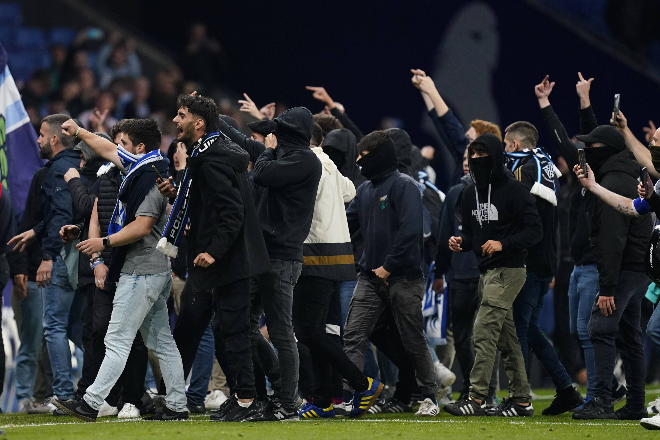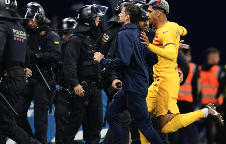 Als das Team rund um Coach Xavi grad den Titel feiert, stürmen plötzlich Espanyol-Ultras auf das Spielfeld und jagen die verfeindeten Barca-Spieler in ihre Kabine.