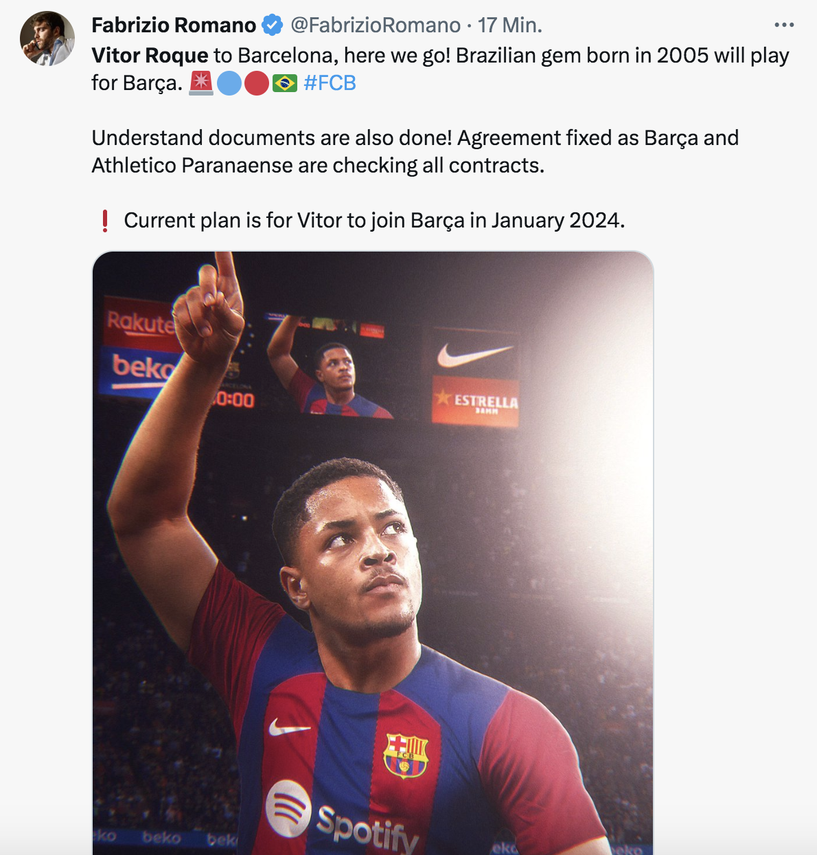 Vitor Roque unterschreibt bis 2029, seine Ausstiegsklausel soll bei 1 Milliarde Euro liegen.
