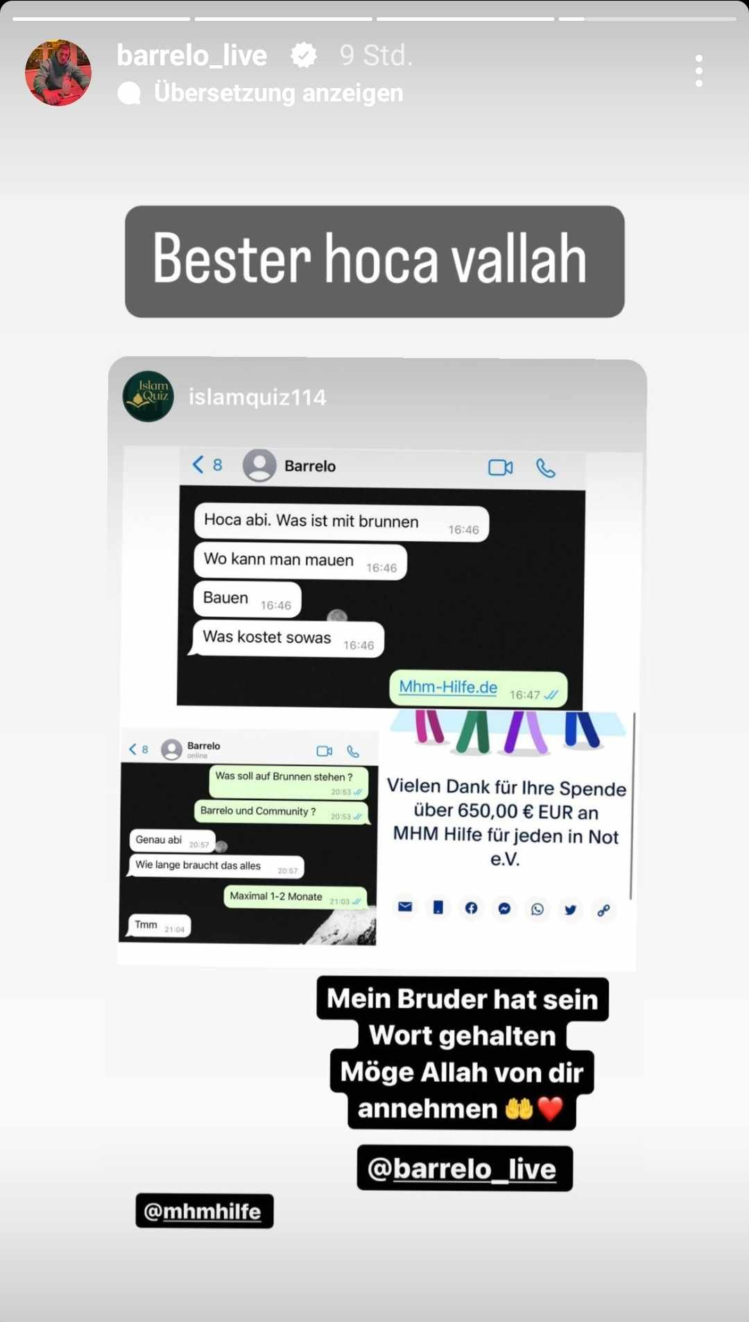 In seiner Instagram-Story zeigt Barrelo, dass er 650 Euro gespendet hat, um einen Brunnen in einem ärmeren Land zu bauen, damit die Menschen eine Trinkwasserzufuhr haben.