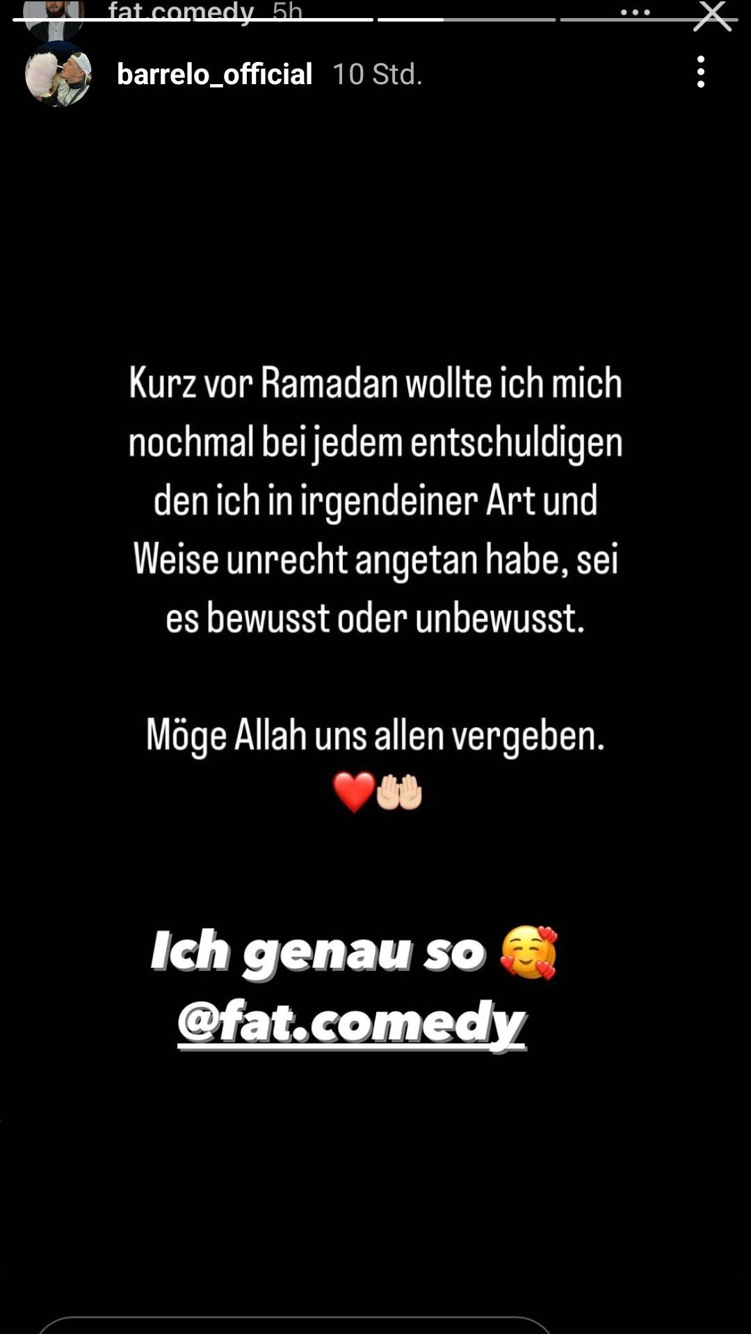 In seiner Instagram-Story teilt Barrelo ein Statement von FatComedy, in welchem er sich bei allen entschuldigt.
