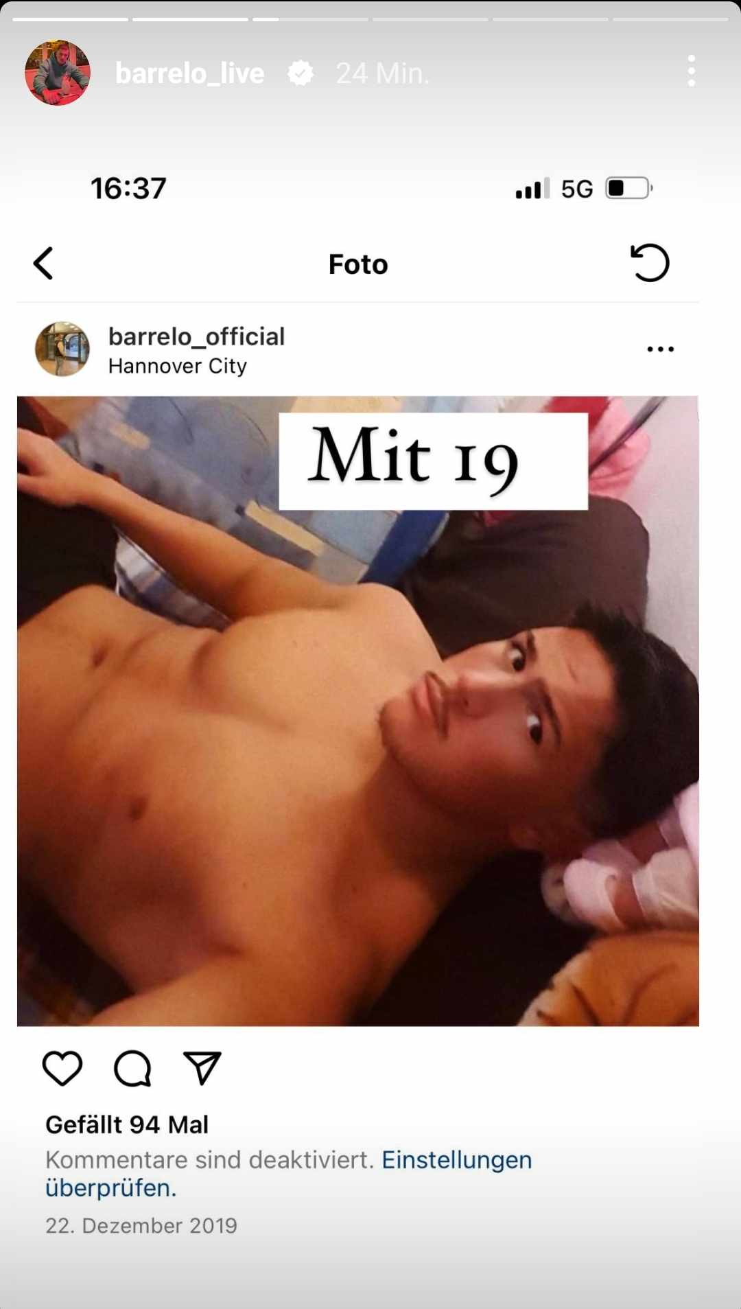 In seiner Instagram-Story zeigt der junge Mann erst ein Oberkörper-Bild von sich mit 19 Jahren.
