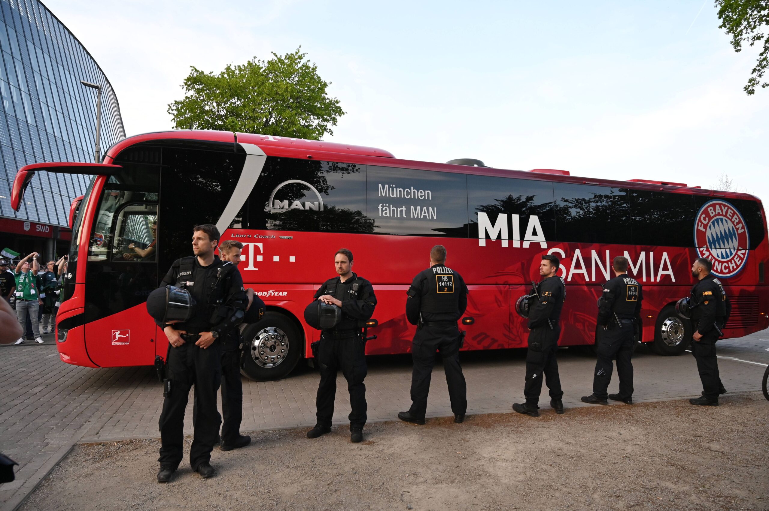 Die Polizei berichtet, dass der Mannschaftsbus der Bayern von einem offenbar geistig verwirrten Mann attackiert wurde.