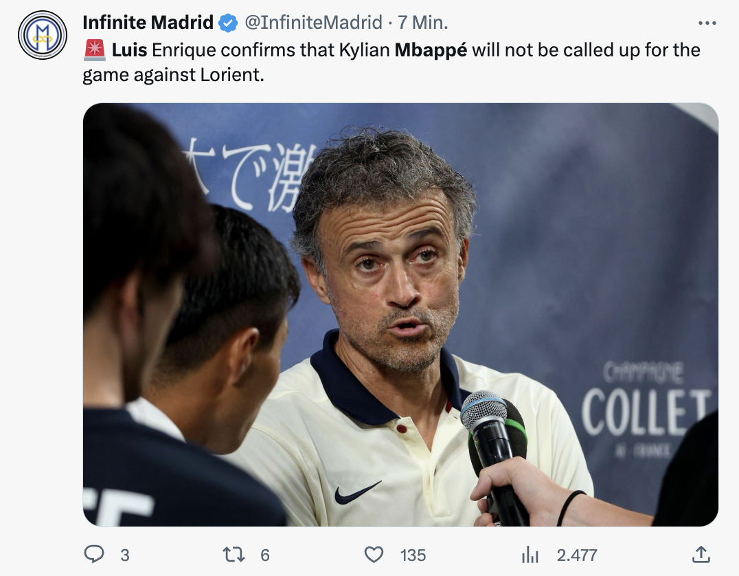 Soeben bestätigt es Trainer Luis Enrique: Mbappe gehört nicht zum Kader für das erste Ligaspiel von PSG gegen Lorient (Samstag, 21 Uhr, DAZN)!