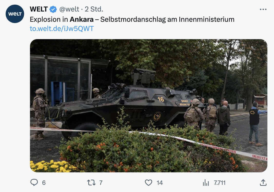 Das Auto hält gegen 9:30 Uhr vor dem Gebäude des Innen-Ministeriums in der türkischen Hauptstadt. Ein Mann steigt aus, plötzlich gibt es eine Explosion. Bombenanschlag!