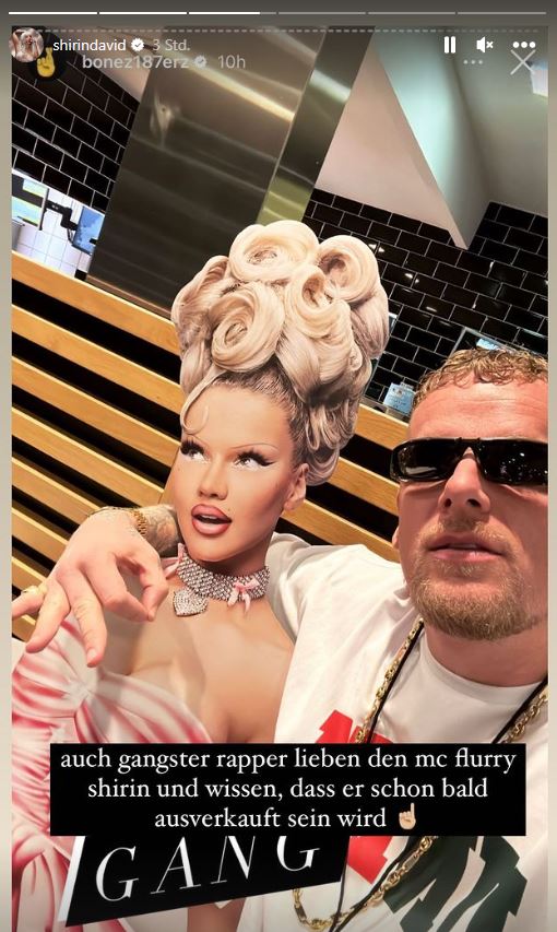 Der 187-Star nimmt sich den Shirin-Aufsteller und knipst ein Foto mit dem Titel