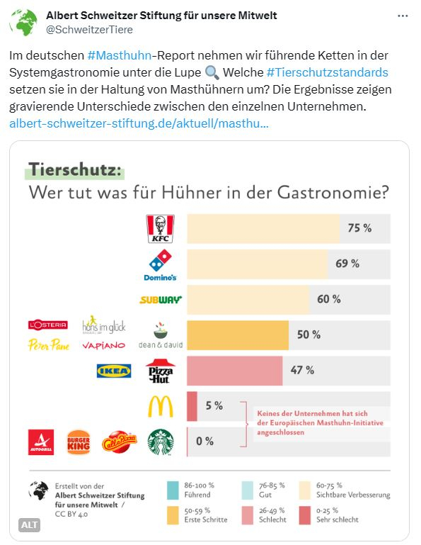 Die Albert Schweizer Stiftung überprüft 15 Fast-Food-Ketten im Hinblick auf ihr Hühnerfleisch. Dabei geht es darum, wie die Tiere gehalten werden.