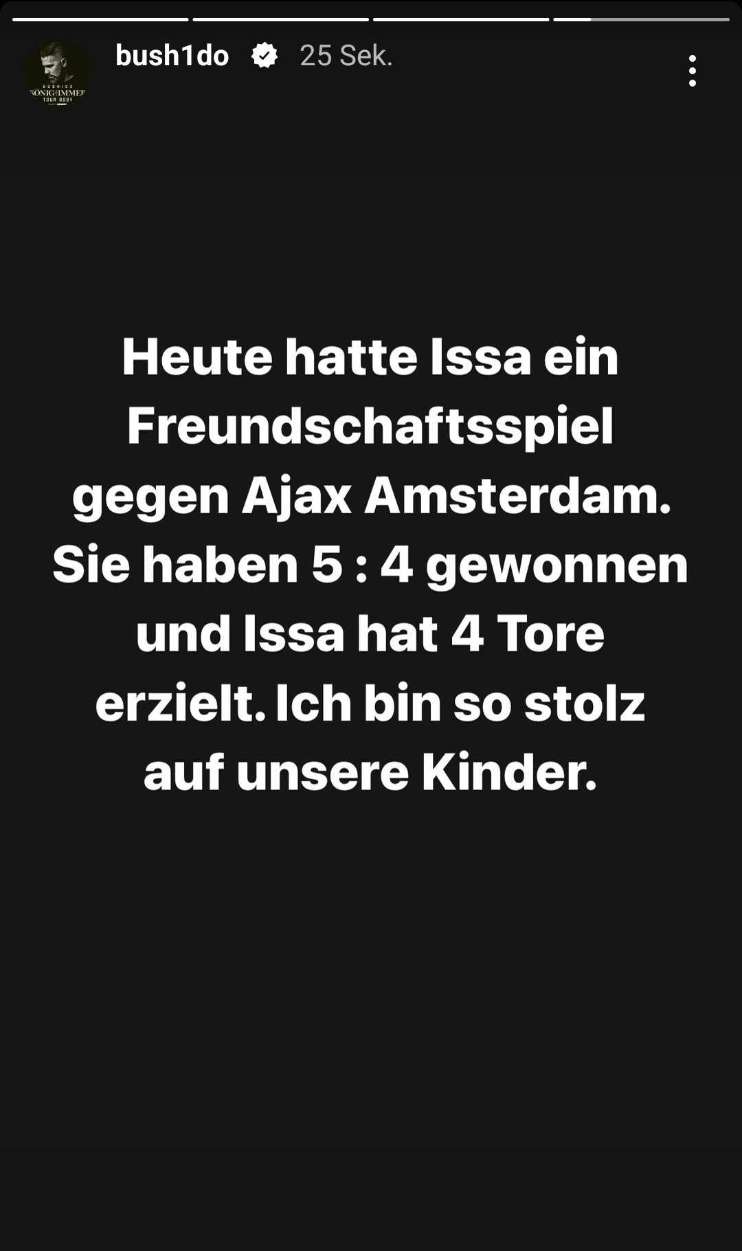 In seiner Instagram-Story verrät Bushido, dass Issa heute ein Freundschaftsspiel gegen Ajax Amsterdam hatte. Das Team des Rapper-Sohnes hat 5:4 zu gewonnen.