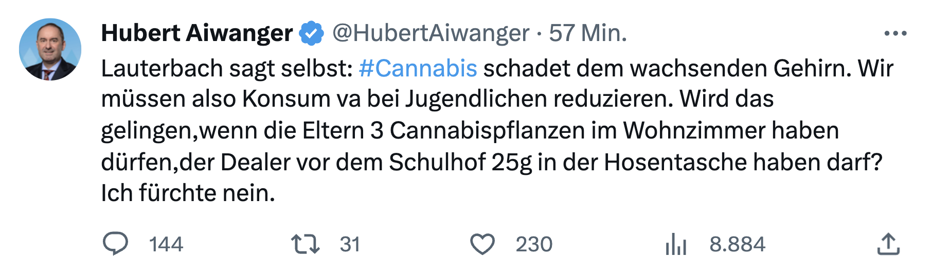 „Lauterbach sagt selbst: Cannabis schadet dem wachsenden Gehirn. Wir müssen also Konsum va bei Jugendlichen reduzieren. Wird das gelingen,wenn die Eltern 3 Cannabispflanzen im Wohnzimmer haben dürfen,der Dealer vor dem Schulhof 25g in der Hosentasche haben darf? Ich fürchte nein“