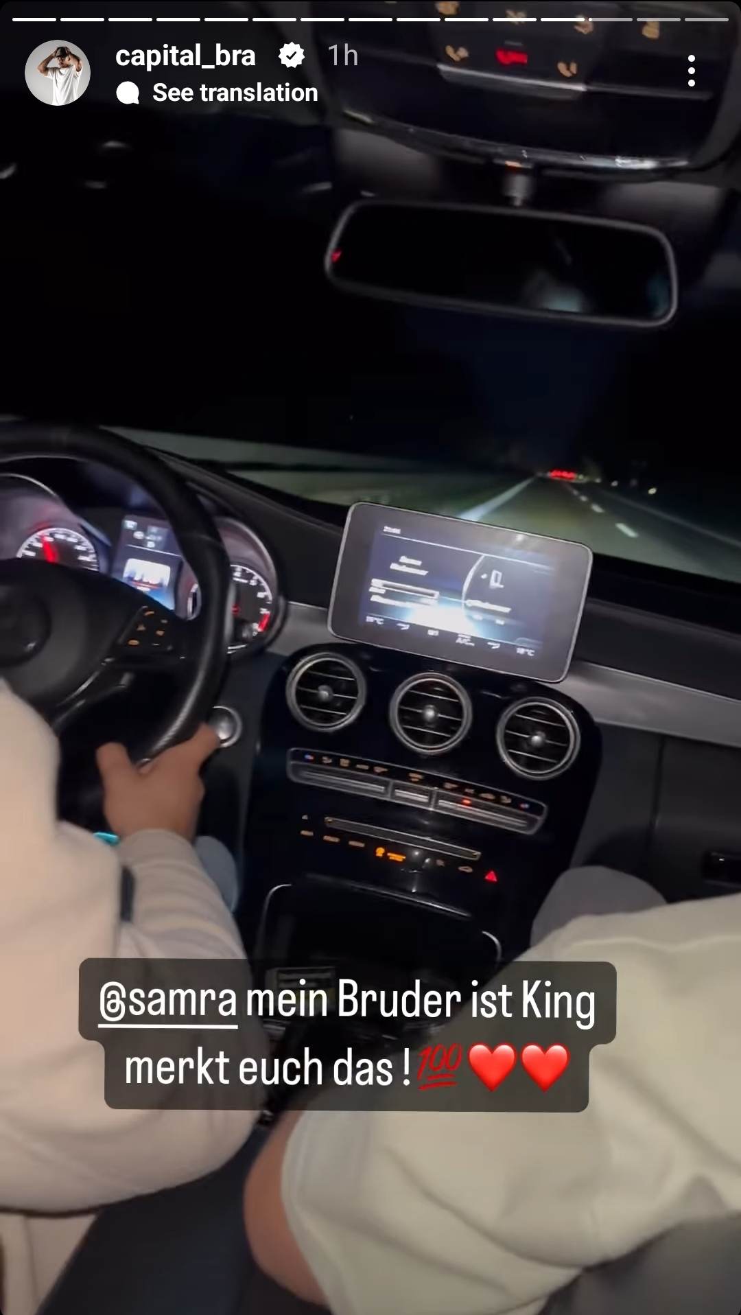 In seiner Instagram-Story hört er einen Song von Samra im Auto und schreibt dazu: