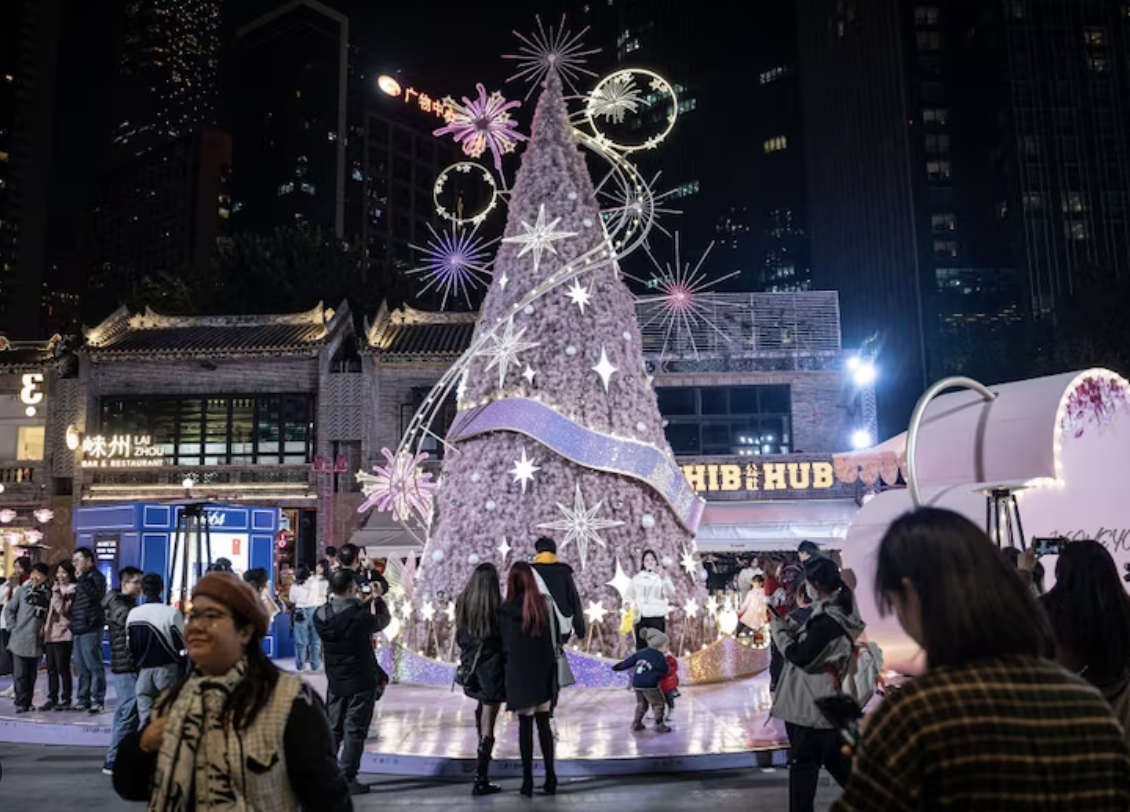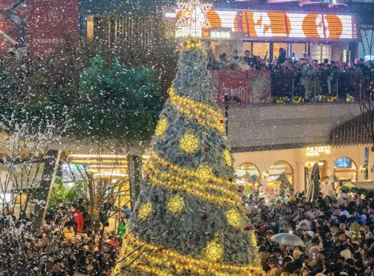 In Großstädten wie Shanghai und Chongqing stehen bislang in vielen Einkaufszentren große, mit Lichtern, Lametta und Geschenkkartons geschmückte Weihnachtsbäume.