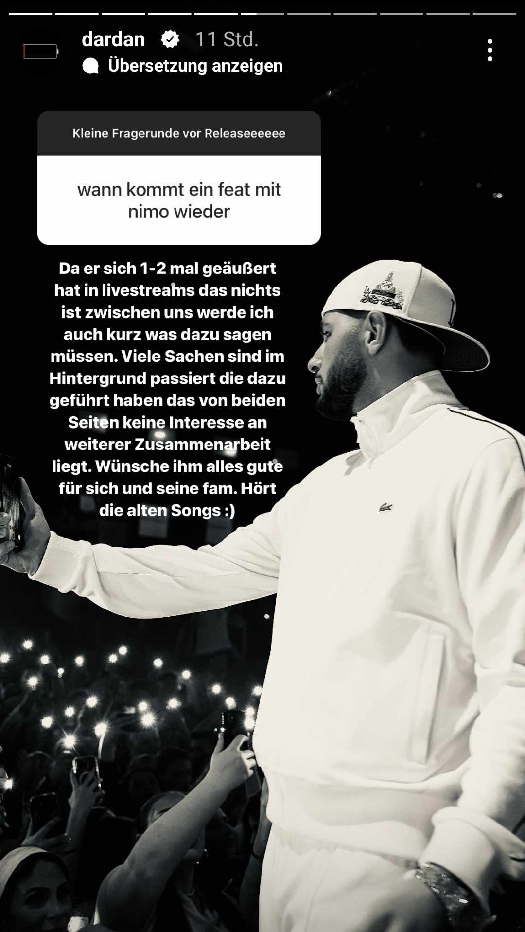 Im Rahmen einer Fragerunde erkundigt sich ein User, wann das nächste Feature von Nimo und Dardan erscheint. Daraufhin verrät der Hypnotize-Boss jedoch, dass es gar keine gemeinsame Musik mehr geben wird…