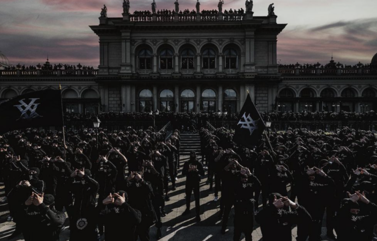 Darauf zu sehen sind hunderte Wiener-Fans, die alle samt in schwarz gekleidet sind und das „XV“-Handzeichen machen.