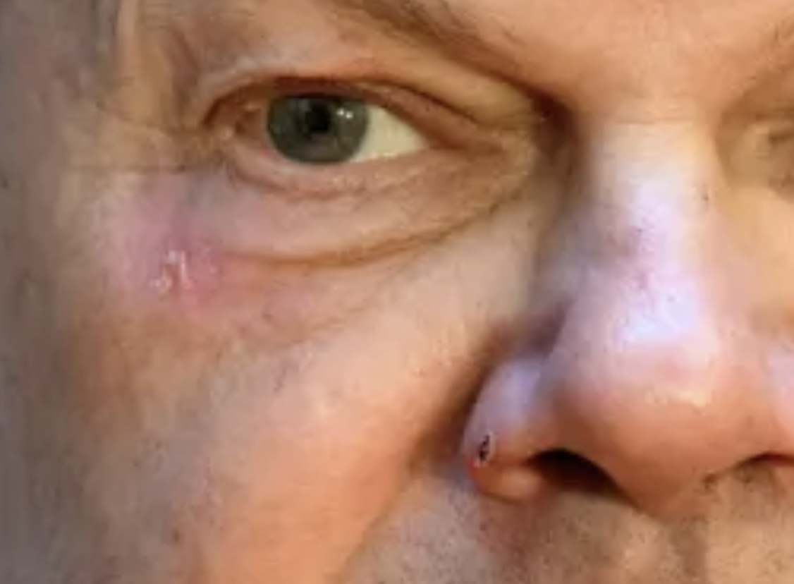 Unter dem rechten Auge ist ein Rest der Verletzung sichtbar, genau so am Nasenflügel.