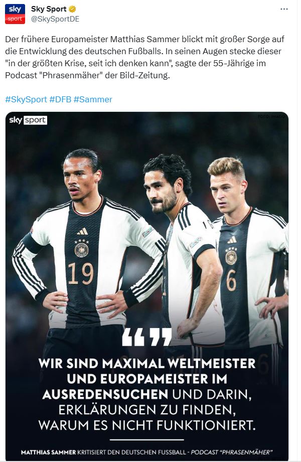 Ansage von Matthias Sammer! Der Europameister von 1996 findet klare Worte für die Leistungen des DFB. Vielen dürfte er damit aus der Seele sprechen.