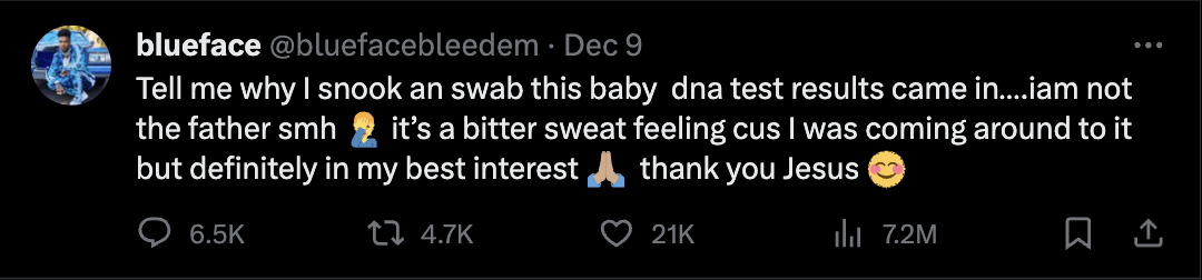 „Das DNA-Ergebnis ist da: Ich bin nicht der Vater. Ich hatte mich schon daran gewöhnt, aber so ist es eh viel besser (…) Ich kann nicht mal so tun, als ob ich nicht überglücklich bin“