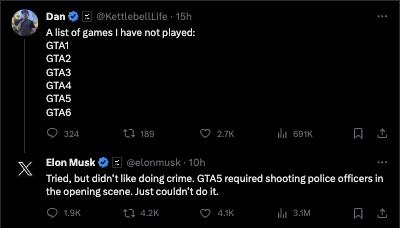 Auf X verrät Elon Musk, dass er schon mal GTA gespielt, ihm es jedoch nicht gefallen hat. Der Grund ist ganz einfach: Das Verbrechen!