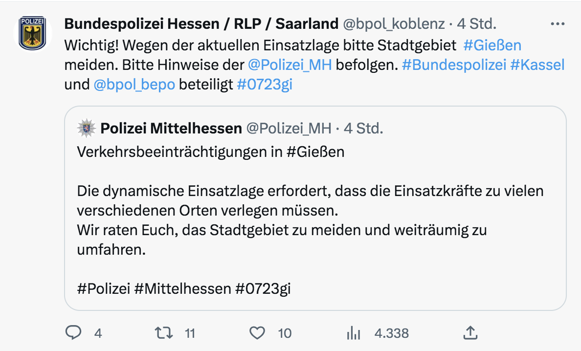 Polizeisprecher Christopher Pfaff empfiehlt allen Menschen, die Innenstadt von Gießen zu meiden. Dort ist die Polizei mit 1.000 Einsatzkräften vor Ort.