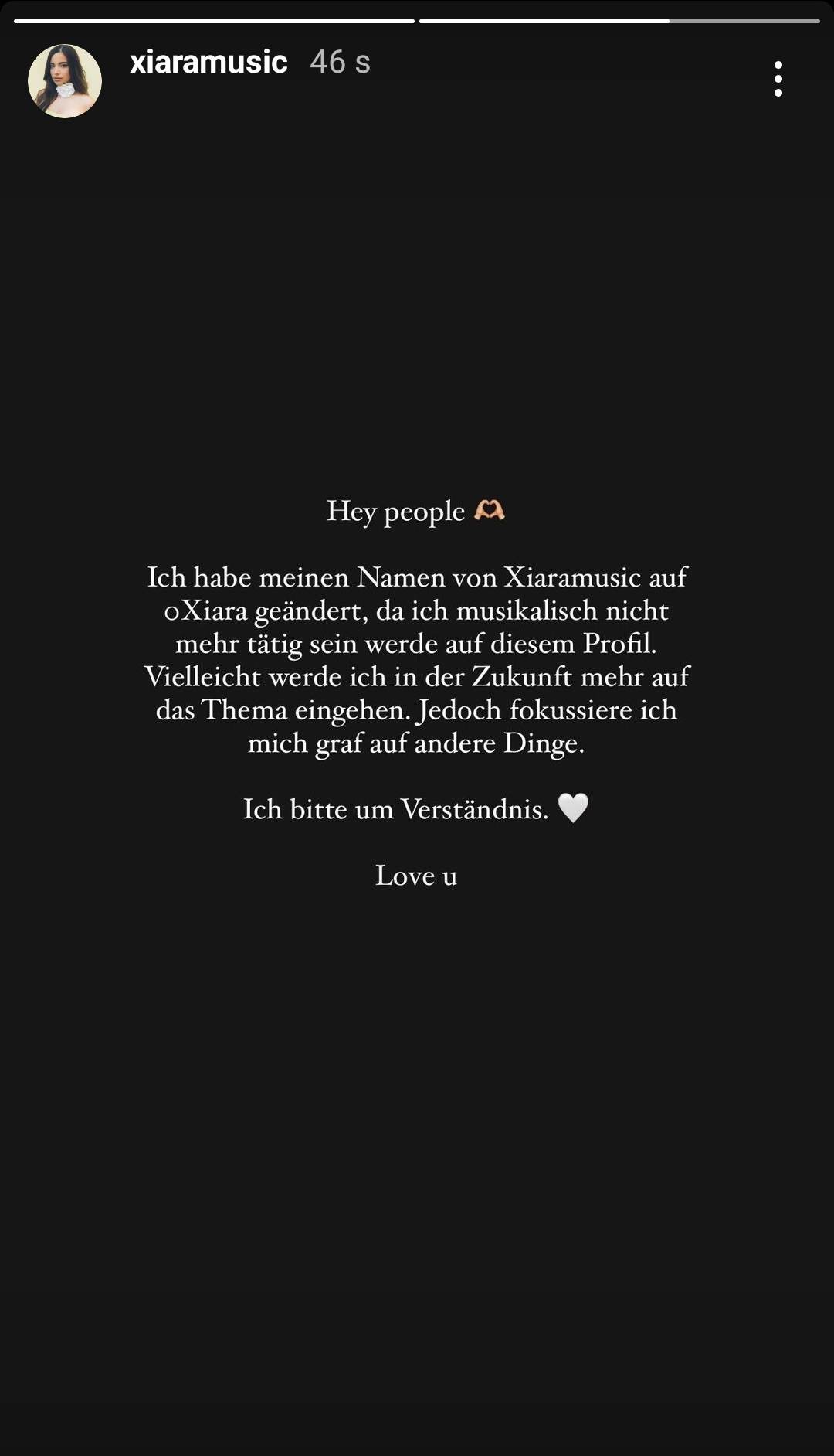 „Ich habe meinen Namen geändert, da ich musikalisch nicht mehr tätig sein werde auf diesem Profil. Vielleicht werde ich in der Zukunft mehr auf das Thema eingehen. Jedoch fokussiere ich mich gerade auf andere Dinge“