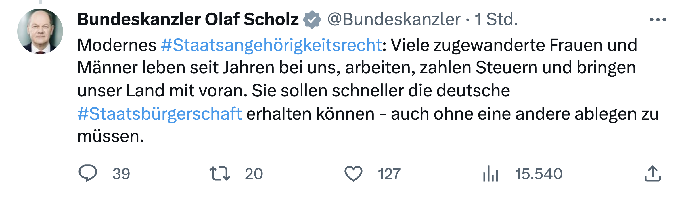 Olaf Scholz und seine Regierung haben die Turbo-Einbürgerung von Ausländern auf den Weg gebracht! Dazu gehört, dass sie künftig Deutsche werden können OHNE den Pass ihres Heimatlandes abzugeben. Nun meldet sich unser Kanzler zu Wort und lobt sich dafür selbst…