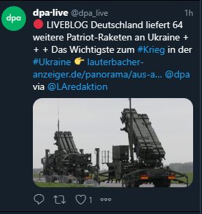 64 weitere Lenkflugkörper für das Flugabwehry-System Patriot stellt Deutschland der Ukraine zur Verfügung.