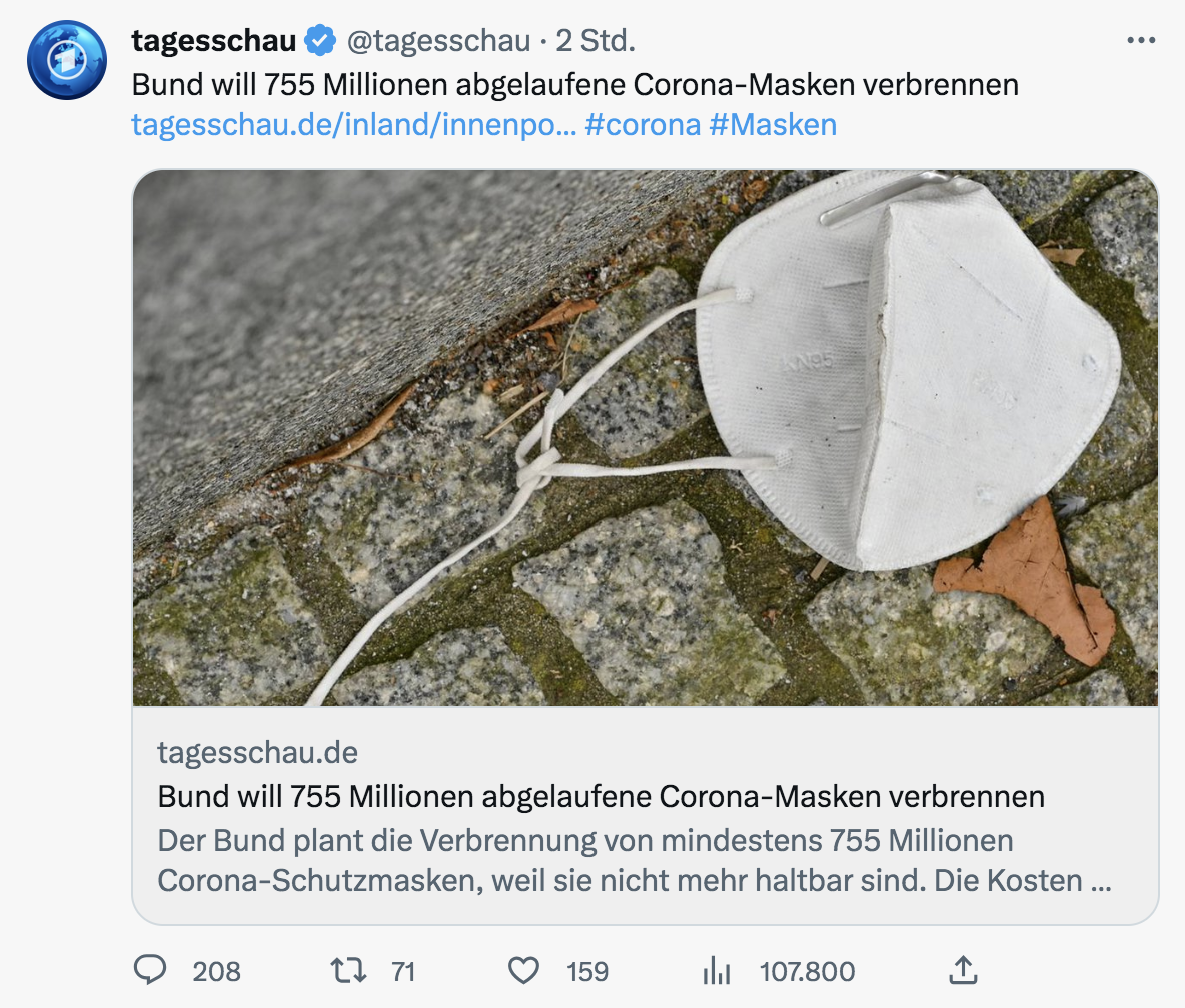 „Der aktuelle Gesundheits-Minister Lauterbach hätte sich rechtzeitig um eine alternative Lösung kümmern müssen – und die Masken etwa in großem Umfang an Arztpraxen, Krankenhäuser oder Behinderten-Einrichtungen abgeben können“