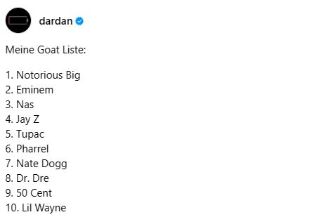 In Deutschland zählt Dardan selbst zu den bekanntesten Rappern des Landes. Ein Blick auf seine GOAT-Liste zeigt, dass sich der Stuttgarter schon lange mit Musik beschäftigt.