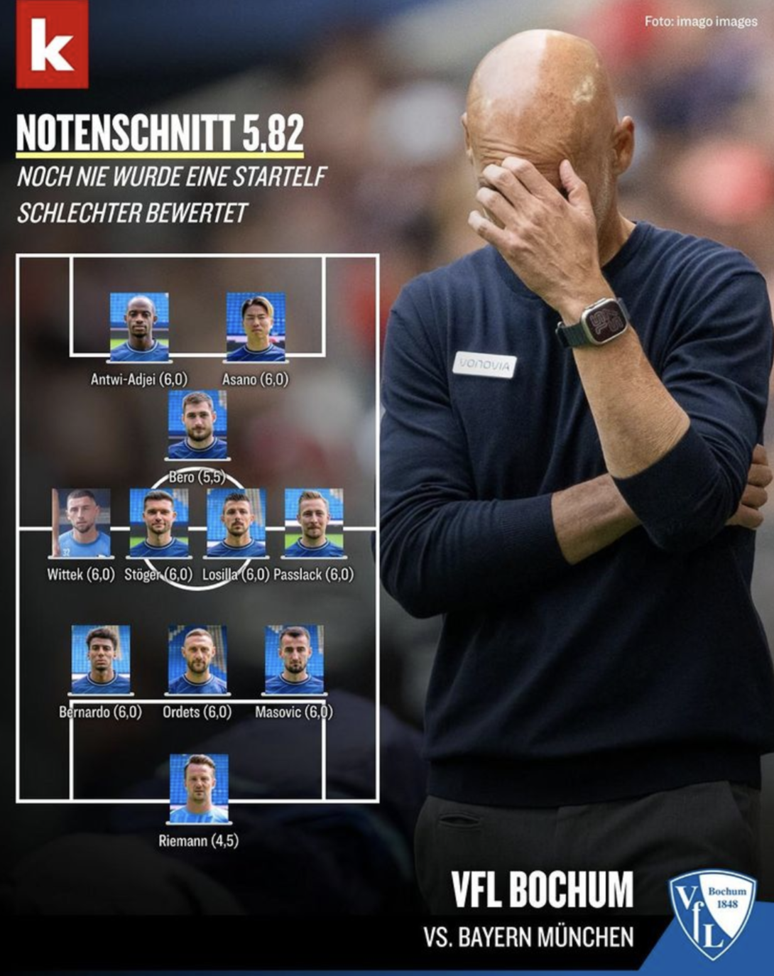 Insgesamt ergeben die Bewertungen einen Notendurchschnitt von 5,82 – noch nie in der Historie des Kicker wurde eine Startelf schlechter bewertet!