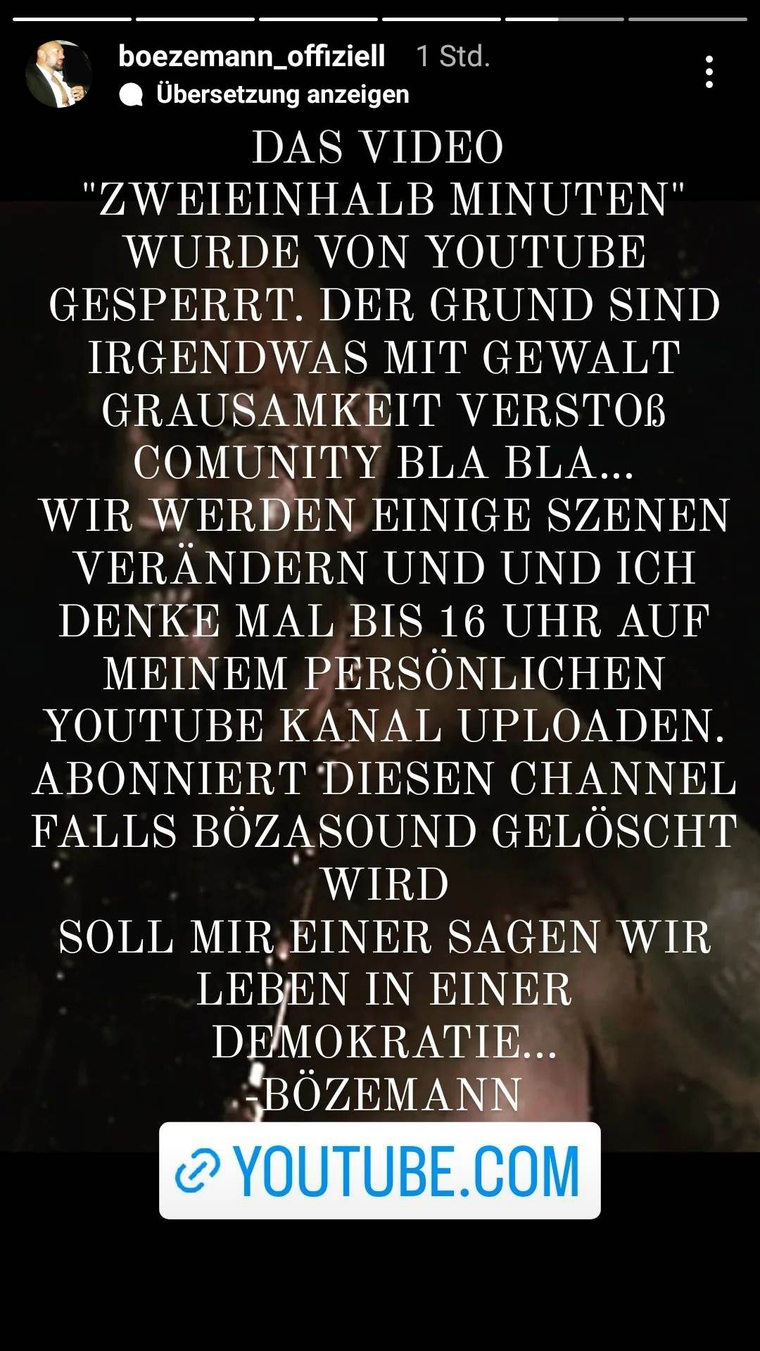 In seiner Instagram-Story gibt Bözemann bekannt, dass sein Video „Zweieinhalb Minuten“ auf YouTube gesperrt wurde.